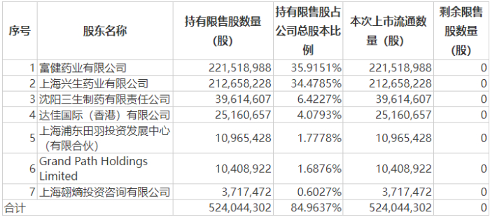 此次三生国健解禁股东共七位,包括大股东富健药业有限公司和二股东上海兴生药业有限公司。还有几位股东持股比例不高。解禁压力不容小觑。