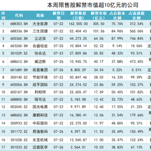 根据计划,大全能源是本周限售股解禁规模最大的公司。公司7月22日有16.25亿股首发限售股上市流通,占总股本的比例75.76%,是解禁前流通盘的超过300%,约合解禁市值305.50亿元。