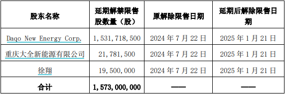 7月21日晚间,大全能源披露自愿延期解禁公告。公司控股股东Daqo New Energy Corp.(下称开曼大全)及其全资子公司重庆大全新能源有限公司(下称重庆大全)和公司实际控制人之一、副董事长徐翔,三位股东分别持有15.32亿股、2178.15万股和1950.00万股公司股份,限售期自愿延长6个月至2025年1月21日。