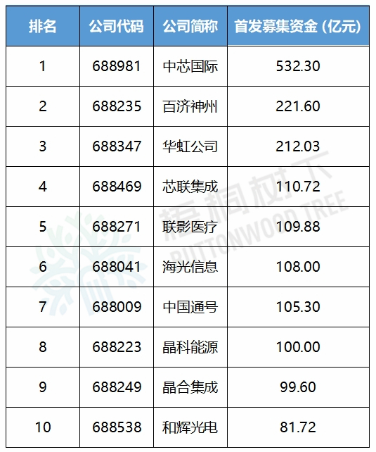 据统计,这573家科创板上市公司首发募集资金超9100亿元,平均每家公司IPO募资额为15.9亿元。按首发募集资金规模来看,排名前十的公司分别为:中芯国际、百济神州、华虹公司、芯联集成、联影医疗、海光信息、中国通号、晶科能源、晶合集成、和辉光电。