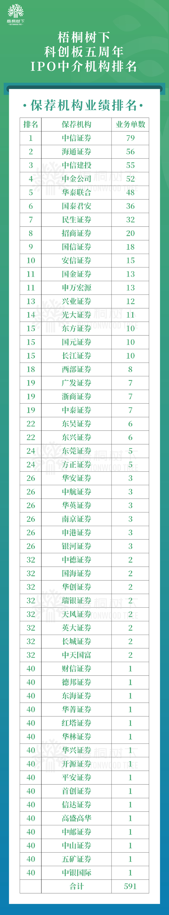 注:其中有18家公司各聘请了两家保荐机构,分别是心脉医疗、虹软科技、中芯国际、江航装备、航亚科技、新风光、长远锂科、同益中、百济神州、天岳先进、希荻微、中无人机、超卓航科、隆达股份、联影医疗、华虹公司、中邮科技、中创股份,各计一单,故业务单数总数为591单。