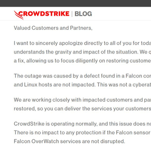 美东时间周日,CrowdStrike表示,由于与软件更新内容相关的缺陷影响,850万Windows系统设备受到影响而宕机,其中大部分已恢复在线运行。