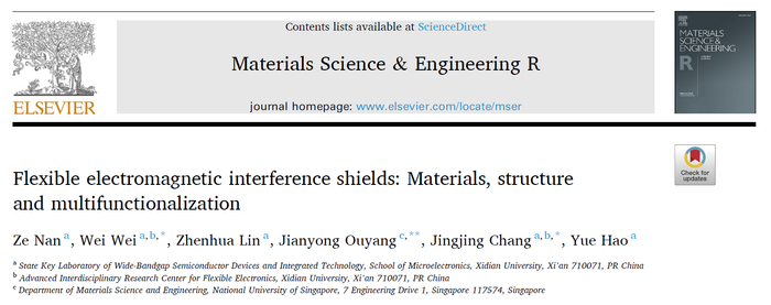 近日,前沿交叉研究院柔性电子研究中心常晶晶教授课题组联合新加坡国立大学JianyongOuyang教授团队在国际顶级期刊Materials Science & Engineering R(中国科学院一区,IF=31.6)发表题为“Flexible electromagnetic interference shields: Materials, structureandmultifunctionalization”的综述文章,博士生南泽为该论文第一作者,魏葳高工、JianyongOuyang教授以及常晶晶教授为共同通讯作者,西安电子科技大学为第一署名单位。截至目前,这是学校首次作为第一单位在该国际权威期刊上发表研究成果。