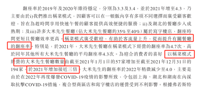 乡村基此前的招股书中称,大米先生翻座率提升的原因之一,就是因为「称菜模式」,顾客可以在一顿饭内享用多项不同选择而广受顾客欢迎,旨在为赶时间享用快速午餐的顾客提供高效便捷的服务。