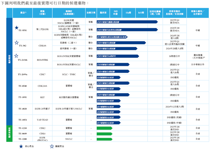 以肺癌为适应症的候选药物 - 包括TY-1091(用于RET阳性融合实体瘤)、TY-4028(用于EGFR 20外显子插入突变的局部晚期或转移性NSCLC)、TY-2699a(用于SCLC)、TY-3200(用于NSCLC)。