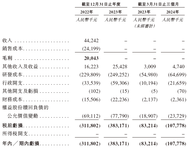 招股书显示,在过去的2022年、2023年和2024年前三个月,同源康医药的营业收入分别为人民币4424.20万、0元和0元,相应的研发成本分别人民币为2.30亿、2.49亿和0.65亿元,相应的净亏损分别为人民币3.12亿、3.83亿和1.08亿元。