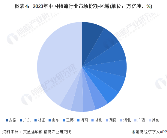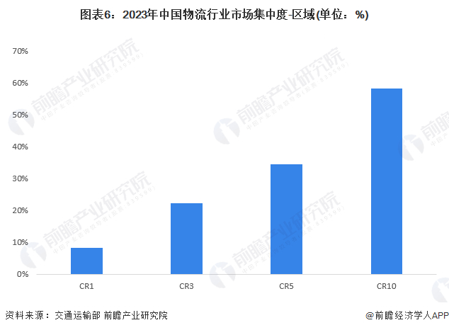 2023年,根据各省市公路水路货运量的市场份额计算,中国物流行业区域市场集中度CR10为58.37%,总体来看物流行业的区域集中程度一般。