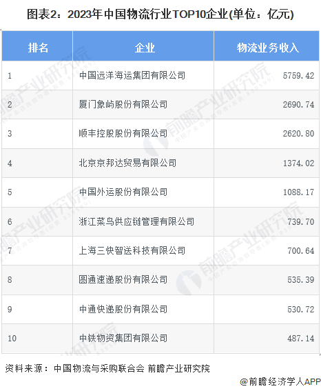 2023年,根据物流业务收入排名,物流行业排名第一的企业为中国远洋海运,收入达5759.42亿元;厦门象屿、顺丰控股、北京京邦达、中国外运依次分列第二至五名,收入均在千亿元以上;浙江菜鸟、上海三快智送、圆通速递、中通快递、中铁物资依次分列第六至十名,收入均在480亿元以上。