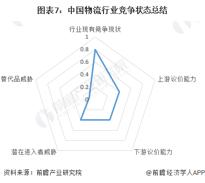 根据以上分析,对各方面的竞争情况进行量化,1代表最大,0代表最小,目前我国物流行业五力竞争总结如下: