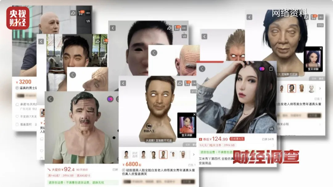 在这两起案件中,犯罪嫌疑人作案时戴着的这种硅胶人脸面具,都是在网上购买的。带着这个线索,《财经调查》记者在多个电商平台展开搜索,果然发现了不少商家正在出售相关的产品。