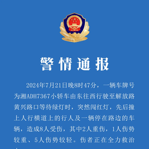 7月22日凌晨,长沙市公安局交警支队通报,7月21日晚8时47分,一辆车牌号为湘ADH7367小轿车由东往西行驶至解放路黄兴路口等待绿灯时,突然闯红灯,先后撞上人行横道上的行人及一辆停在路边的车辆,造成8人受伤,其中2人重伤,1人伤势较重、5人伤势较轻。伤者正在全力救治中。