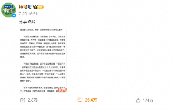 “人没塌,节目塌了。”网友的这句评价或许就是综艺节目《种地吧》目前所面临的处境。7月19日,《种地吧》发布招聘启事,为即将开拍的第三季招人,引发众多粉丝担忧第三季将加新人,并表示出比较强烈的反对态度,在7月20日节目组回应后,非但没有平息粉丝们的怒火,反倒争议愈发激烈,几天时间官微掉粉已超75万。