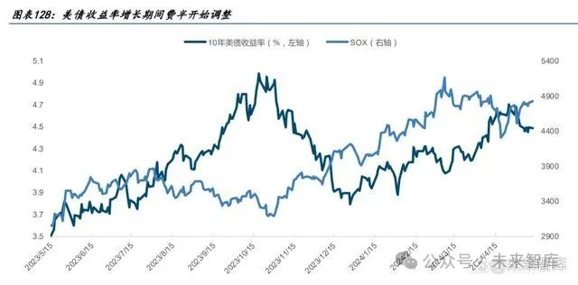 费城半导体指数今年以来呈现先涨后跌的态势,3 月初以前维持上涨态势,3 月初~4 月进 入调整阶段。截至 2024 年 5 月 10 日收盘,费城半导体指数达到 4808.03 点,较 1 月 2 日的 4023.04 点上涨 19.51%。 从历史上来看,在费城半导体指数从底部到顶部的上涨阶段当中,一般会经历 2~3 次中期 调整,09 年以来费城半导体中期调整幅度在 7.71%~19.49%。我们认为本次费城半导体指 数的调整主要来自流动性收缩导致的估值中枢下降。24 年 3 月 7 日费城半导体为 5156.83,4 月 19 日为 4306.87,调整幅度为 16.63%,同期 10 年美债收益率从 4.08%增长 至 4.62%,流动性预期明显转差。 考虑费城半导体指数历史上中期调整的幅度,市场继续向下空间有限。另外随着流动性预 期有一定恢复以及主要公司一季度业绩及二季度指引维持增长,我们认为费城半导体本次 中期调整已经结束。目前费城半导体指数已经基本回到调整前位置,我们认为未来市场上 涨动力将来自:1)流动性预期转好后整体估值中枢的提升;2)个股业绩驱动带动 EPS 增长的机会。