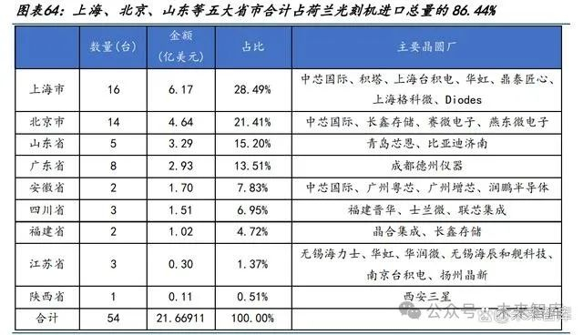 24Q1 光刻机到货主要集中于上海、北京、山东、广东四大省市。2024 年 1-3 月,我国光 刻机的进口数据显示,全国共有 9个省市参与进口,总计进口光刻机数量呈现地域性集中 趋势。其中,上海市、北京市、山东省、四川省和广东省位列进口量前五名。五大省市合 计占全国光刻机进口总量的 86.44%,分别和对应的晶圆及半导体企业规模成正比。上海 市以 6.17 亿美元的进口额占比最高,达 28.49%,北京市以 4.64 亿美元紧随其后,占比 21.41%,而山东、广东和安徽都超过1亿美元进口量,占比分别达到15.2%、13.51%和7.83%。