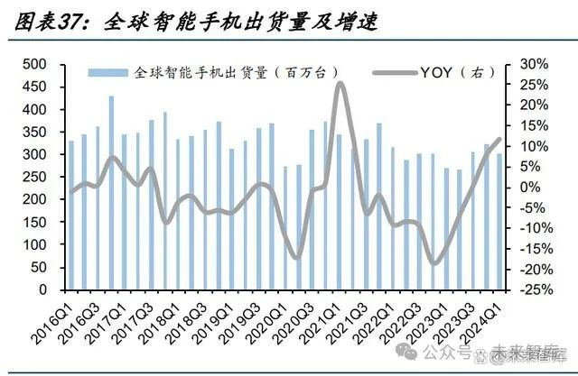 从需求端来看,根据 IDC,2024 年 Q1 全球智能手机出货量为 3 亿部、同增 11.8%;智能 手机从 2021 年 Q3 以来经历了 8 个季度的下行周期,需求逐步回暖。预计 2024 年全球智 能手机出货量达12 亿部、同增 3%,2028 年达 13 亿部,2023~2028 年 CAGR 达 2.3%。分区 域来看,2024 年 Q1 中东和非洲智能手机出货量同增 31%、拉美智能手机出货量同增 23%, 新兴市场需求增速领先,北美、中国需求增速跑输全球。