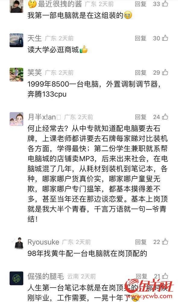网友“月半x!an”分享:“何止经常去?从中专就知道配电脑要去石牌,老师都讲要去石牌每家对比装机各方面,学得最快;第二份学生兼职就是帮电脑城的店铺卖MP3,后来进入社会,在电脑城混了几年,从耗材到装机到笔记本……基本上岗顶就是我大半个青春,千言万语就一句——爷青结!”