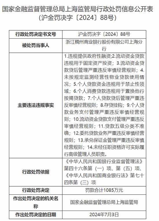 金融监管总局官网信息显示,2024年7月3日,金融监管总局上海监管局决定对稠州银行上海分行罚款合计1085万元。