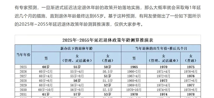 根据上述自媒体公众号文章介绍,这一结论来自于一张《退休年龄对照表及相关规定》和《2025年-2055年延迟退休政策年龄测算推演表》。那么这个表有官方依据吗?