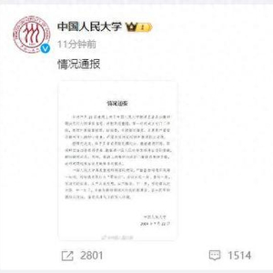 中国人民大学高度重视师德师风建设,严格坚持师德师风第一标准,对师德失范行为“零容忍”,坚决发现一起、查处一起依规依纪依法、从严从快处理,决不姑息。下一步,学校将以此为鉴、举一反三,全面加强师德师风长效机制建设,坚决筑牢师德师风防线,营造风清气正的育人环境,