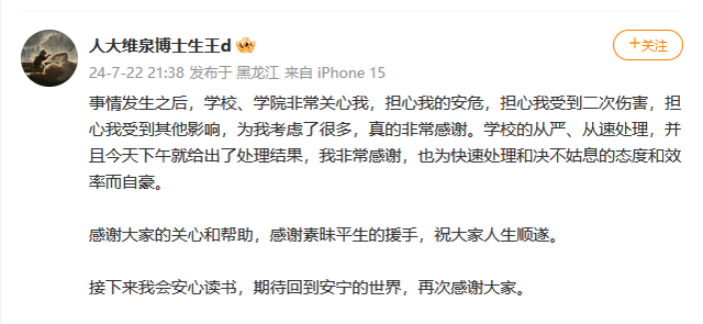 中国人民大学发布通报后,当事人在社交媒体回应称,“事情发生之后,学校、学院非常关心我,担心我的安危,担心我受到二次伤害,担心我受到其他影响,为我考虑了很多,真的非常感谢。学校的从严、从速处理,并且今天下午就给出了处理结果,我非常感谢,也为快速处理和决不姑息的态度和效率而自豪。”