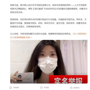 7月21日晚,有网友自称中国人民大学文学院在读博士生王迪发文,实名举报其导师人大文学院原党委书记兼副院长王贵元教授曾于2022年5月对其进行性骚扰和强制猥亵,并要求发生性关系。该举报者称,王贵元在遭到拒绝后的两年多时间打击报复,并威胁其不能毕业,并表示以上举报均有录音和聊天记录作为证据,愿意承担相应法律责任。
