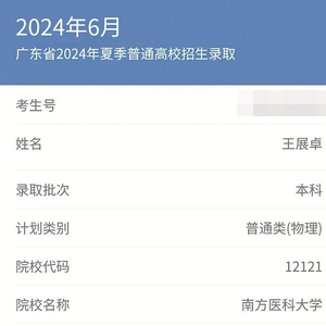 今年五月底,王展卓势如破竹,在联考中脱颖而出。6月25日,高考成绩揭晓,王展卓以高分圆满收官,其中语文120分,英语132分,总分超出特殊控制线79分之多,成功被南方医科大学临床医学专业录取,顺利圆梦。他以勤奋、专注、忍耐、坚持,为自己的三年高中生涯画上了完美的句号。