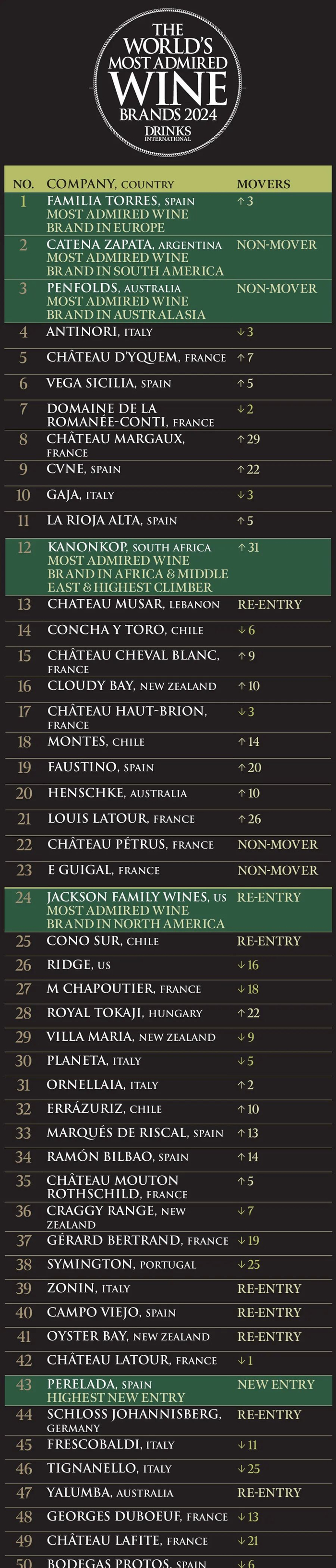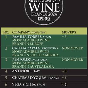 2024年度全球最受赞誉的50个葡萄酒品牌,桃乐丝、卡帝娜、奔富名列前三