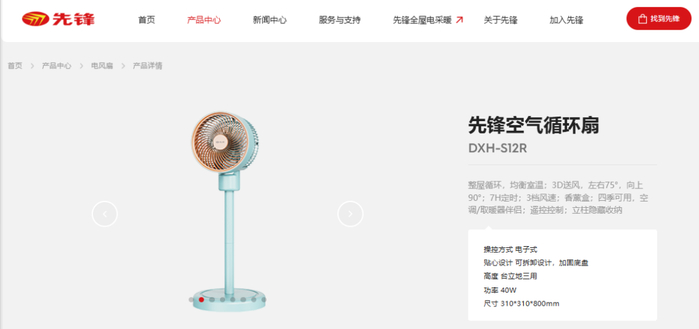 而标称生产企业为“宁波先锋电器制造有限公司”的一款电风扇(型号:DXH-S12R)在今年4月广东省市场监督管理局的抽检中被判定为“噪声”不合格。公开资料显示,宁波先锋电器制造有限公司成立于2009年,为先锋电器集团成员,是一家以从事电气机械和器材制造业为主的企业,为国家高新技术企业。目前,在该公司官网仍能搜到这款风扇的介绍页面,但《消费者报道》从先锋电器天猫官方旗舰店的客服处了解到,这款产品目前已经停产。
