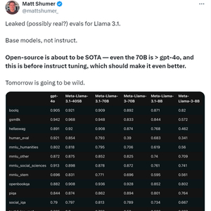 7月23日凌晨,有人爆料,Meta的Llama 3.1-405B评测数据遭遇泄漏,明天可能会发布Llama 3系列中最大的参数模型,同时还会发布一个Llama 3.1-70B版本。