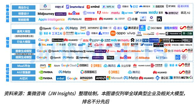 结合AI大模型产业链情况,集微咨询(JW Insights)绘制了“2024全球AI大模型产业图谱”,结构划分为基础设施层、模型层、场景应用层。其中基础设施层包括AI芯片、AI计算集群、MaaS平台;模型层按适用场景分类分为通用大模型和行业大模型,按功能用途分类分为图像生成模型和视频生成模型;场景应用层涵盖商业办公、创意设计、智能助理。