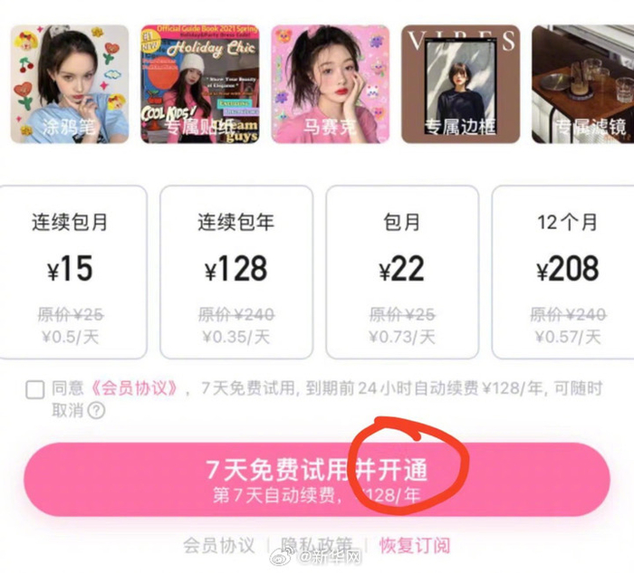 ——文字“障眼法”:大字吸引眼球,小字暗藏套路。不少消费者反映,App软件常将“免费试用”“1元享7天”等“大字”设计在交互页面的醒目位置,或直接通过弹窗吸引用户注意,而“第7天自动续费,¥128/年”等信息则以“小字”形式出现,涉及“会员协议”等内容更需要消费者专门点击,跳转页面后才能查看,整个支付过程一闪而过,通过模糊的表述诱导消费者消费。山东枣庄的张女士在被扣款后详细翻阅该软件的使用协议,未发现任何有关免费试用的解释条款。