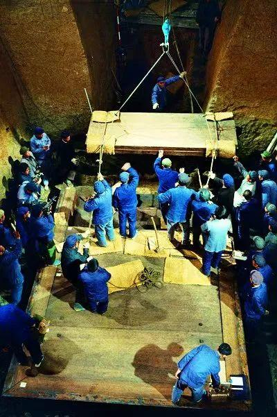 发掘现场,工作人员吊出沉重的椁板。