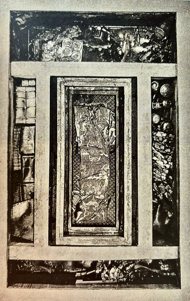 一号墓“井”字形椁室,中间为T形帛画出土时的状态。