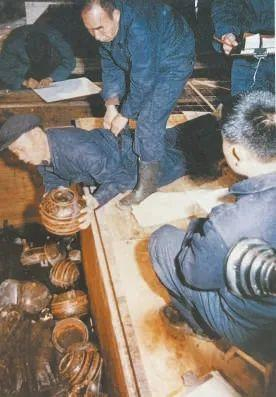 只能在墓中寻找线索。考古人员研究决定,照相、登记、编号、包装,分工合作,先逐一清理四个边厢,最后清理中央的主棺室。边厢里的文物堆得有一人高,厢底有几十厘米水,只能由老技工任全生趴在旁边的盖板上俯身拿取。