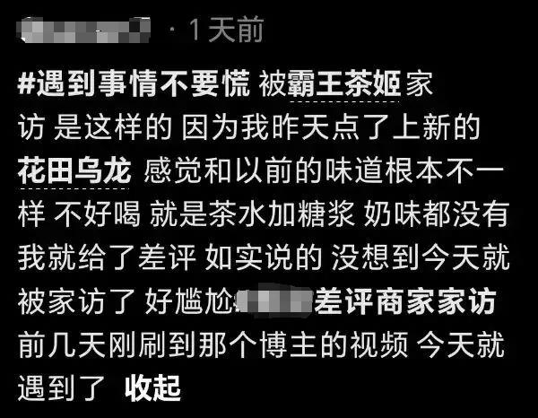 近日,一网友发布视频称,他点的霸王茶姬饮品和此前味道不同,“不好喝”,给了差评,“没想到今天就被家访了”。
