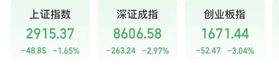 A股今天一开盘,就开启调整模式。早盘阶段,深证成指、创业板指率先调整,午后,上证指数开始补跌,跌幅扩大。截至收盘,上证指数下跌1.65%,深证成指下跌2.97%,创业板指下跌3.04%。