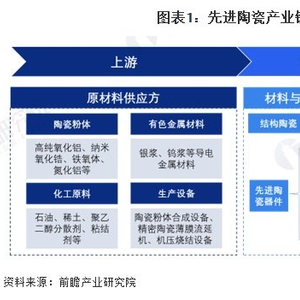 目前,先进陶瓷上游陶瓷粉体环节参与者包括国瓷材料、中国铝业和东方锆业等,有色金属材料行业代表企业有聚和材料、儒兴科技等,化工原料行业企业众多,代表有中国石化、中国稀土集团等,先进陶瓷生产设备有科达制造、中础窑炉和中环电炉等;行业中游先进陶瓷材料和零部件生产企业有西安鑫垚、超码科技、博云新材、火炬电子、奥福环保、国瓷材料等。