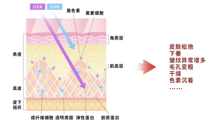 同时,在氧化反应下正常细胞功能改变,造成不同程度的光损伤积累,比如加剧角质异常增厚的“粗糙”、黑色素合成增多的“暗沉”、加重糖化氧化导致的“蜡黄”等肉眼可见的皮肤光老化损害问题。