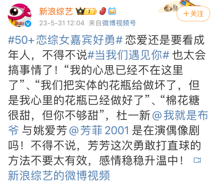 腾讯视频最新的老年题材纪录片《前浪》,一上来就带观众去探访了上海的老年相亲角。75+大爷大妈对爱情的越战越勇、甜蜜体验,绝对可令年轻人自惭形秽。而早在2021年,“中老年恋综”就在互联网上成为话题。当时这还是对地方台土味节目的调侃,浙江卫视2023年的《当我们遇见你》则真开始用恋综模式做中老年相亲。