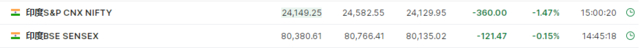 印度股市基准股指Nifty 50指数跌逾1%,SENSEX指数也一度跌至1%。