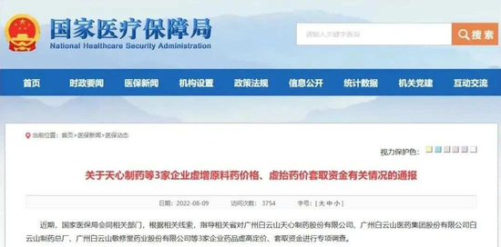 2022年8月,国家医保局发布《关于天心制药等3家企业虚增原料药价格、虚抬药价套取资金有关情况的通报》,通报了广州白云山天心制药股份有限公司(以下简称天心制药)、广州白云山医药集团股份有限公司白云山制药总厂(以下简称白云山制药总厂)、广州白云山敬修堂药业股份有限公司(以下简称敬修堂)3家企业药品虚高定价、套取资金的问题。