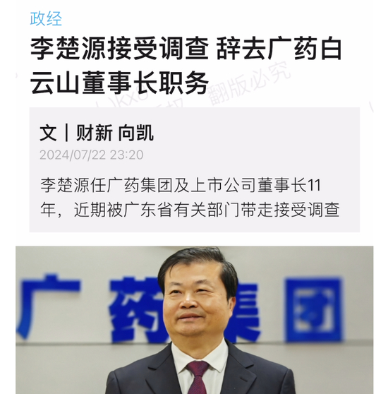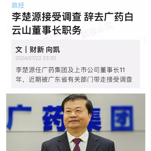 昨晚,广州白云山医药集团股份有限公司发布公告,称收到公司董事长李楚源的书面辞职报告,公告内容显示,李楚源因个人原因,辞去公司第九届董事会董事长、执行董事及董事会战略发展与投资委员会主任职务。