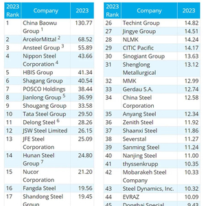 2023年全球粗钢产量50大企业名单,宝武集团、安赛乐米塔尔、鞍钢集团排在前三位