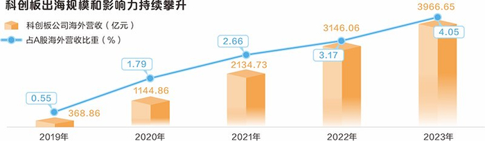 科创板开市以来,出海规模呈逐年上升趋势。截至2023年末,科创板公司出海规模(海外营收)达3966.65亿元,较2022年增加820.59亿元,增幅26.08%;较2019年科创板开市年份的数据368.86亿元已增长975.38%。