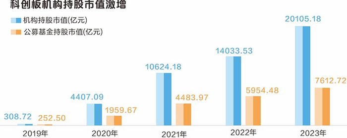 科创板开市以来在支持“硬科技”企业发展、加速科技成果向现实生产力转化方面发挥了积极作用,科研投入和丰硕的创新成果,持续吸引着机构资金涌入。据数据宝统计,截至2023年末,科创板机构持股市值达2.01万亿元,较上年增长43.27%。