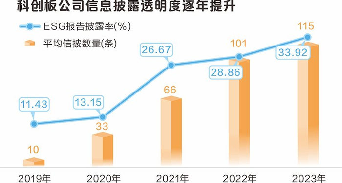 科创板公司ESG报告披露率也保持上升趋势。2021年度,科创板公司披露ESG报告公司数量首次突破100家,2023年度达到192家;ESG报告披露率由2019年的11.43%提升至2023年的33.92%。