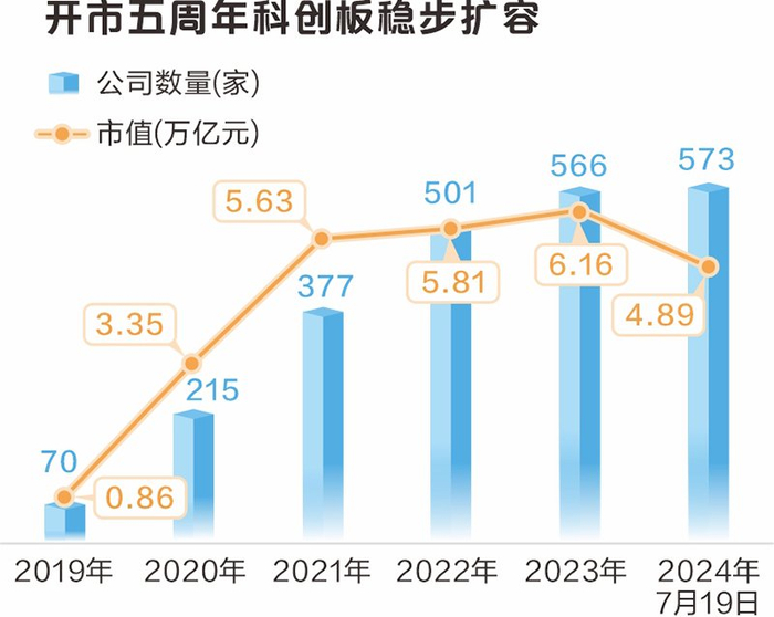 5年来,科创板平稳运行。2019年7月22日,首批25家公司鸣锣上市。2019年科创板上市公司共70家;截至2024年7月19日,共有573家科创板公司登陆A股(不含2家退市公司),最新市值合计4.89万亿元。