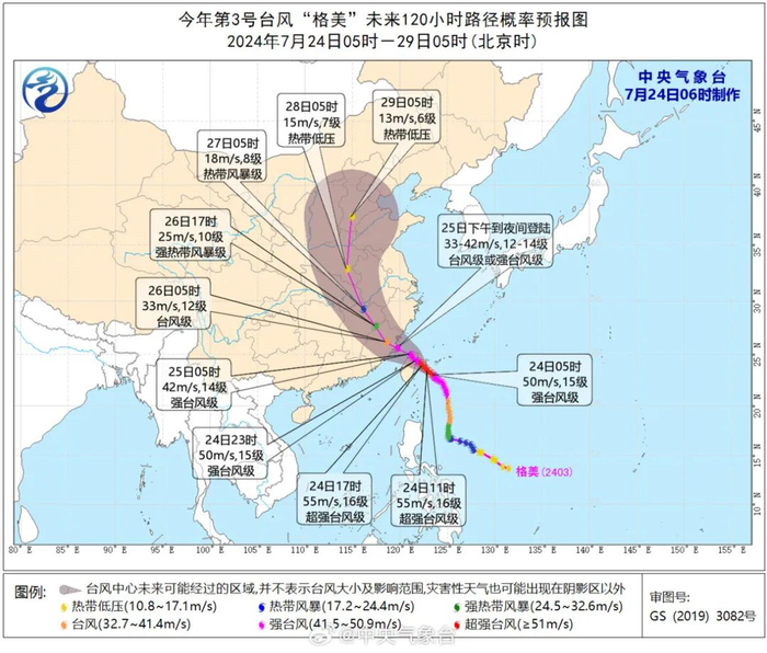 预计,“格美”将以每小时10~15公里的速度向西北方向移动,强度逐渐增强,并将于24日晚上在台湾岛中北部沿海登陆(强台风级,14~15级,45~50米/秒)。之后穿过台湾岛,将于25日下午到夜间在福建福鼎到晋江一带沿海登陆(台风级或强台风级,12~14级,33~42米/秒)。