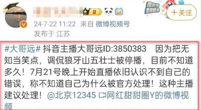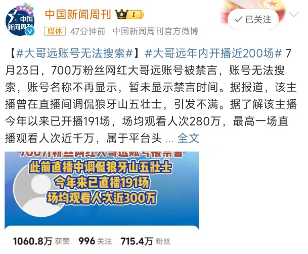 7月23日,700万粉丝网红大哥远账号被禁言,账号无法搜索,账号名称不再显示,暂未显示禁言时间。