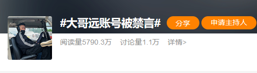 23日晚,#大哥远账号被禁言#一度冲上微博热搜第一。